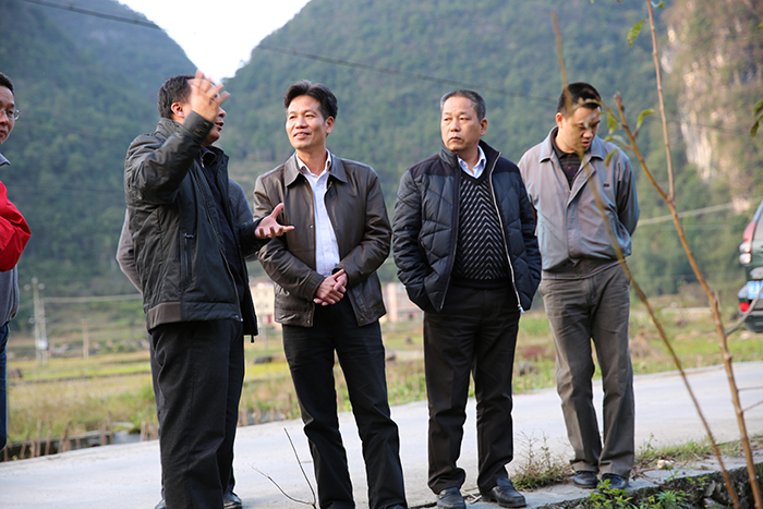 集團(tuán)公司朱堅和董事長(左三)、張友坐副書記(右一)聽取駐村”第一書記“梁義寬匯報工作。 在相堯村、豹山村、才帛村,朱堅和董事長分別與當(dāng)?shù)劓?zhèn)、村干部以及覃獻(xiàn)康、梁義寬、蔣博三位派駐農(nóng)村“第一書記”和扶貧工作隊隊員進(jìn)行親切交談,詳細(xì)詢問“第一書記”工作、生活情況,并聽取了“第一書記”關(guān)于幫扶村的黨建及村集體經(jīng)濟(jì)發(fā)展情況匯報。得知目前各駐村書記及扶貧工作隊員已經(jīng)完成精準(zhǔn)扶貧入戶摸底調(diào)查時,朱堅和董事長對“第一書記”到村以來,深入調(diào)查走訪,積極幫助村里理思路、定規(guī)劃、辦實(shí)事,表示充分肯定。