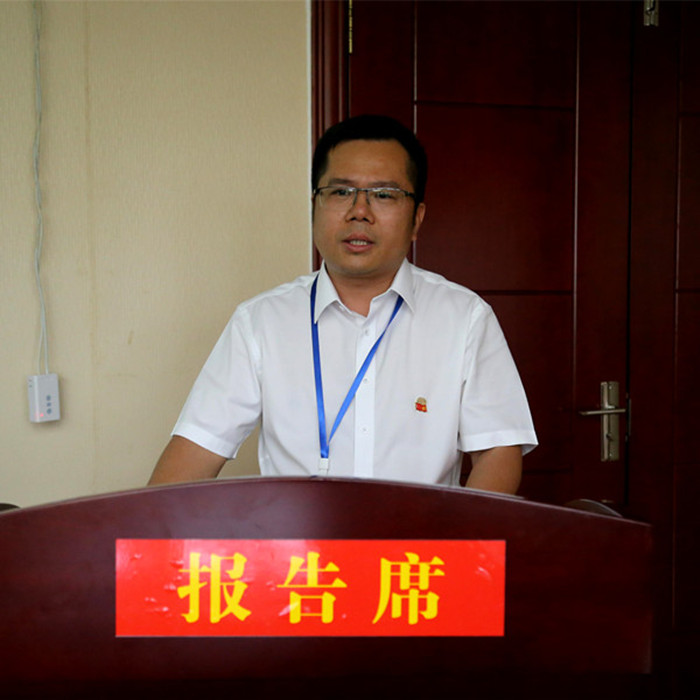 圖二:新恒通公司黨委副書記、副董事長、總經(jīng)理、總工程師藍(lán)日彥在本部站為活動致辭
